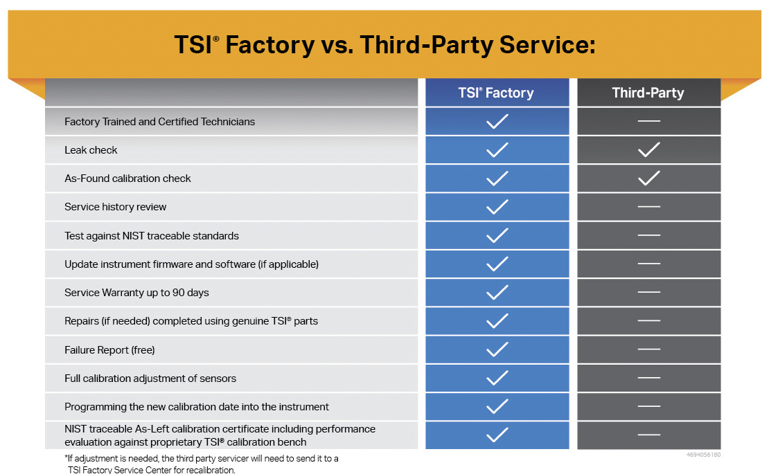While third-party labs can only verify your instrument, TSI can perform multipoint calibration and adjustments, update software, firmware and repair with original parts – all from certified factory-trained technicians.