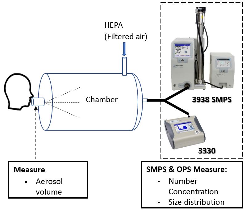 The Optical Particle Sizer (OPS) 3330 is another instrument that can measure airborne particles in the 0.3 to 10 µm size range, but with a lower size resolution compared to the APS™ 3321. This spectrometer uses a light-scattering technique to provide a response that is dependent on the refractive index of the measured particles. For example, the illustration below shows an experimental setup using TSI instruments. In this experiment, researchers sought to measure the size distribution and concentration of aerosol particles emitted by a person during coughing events.